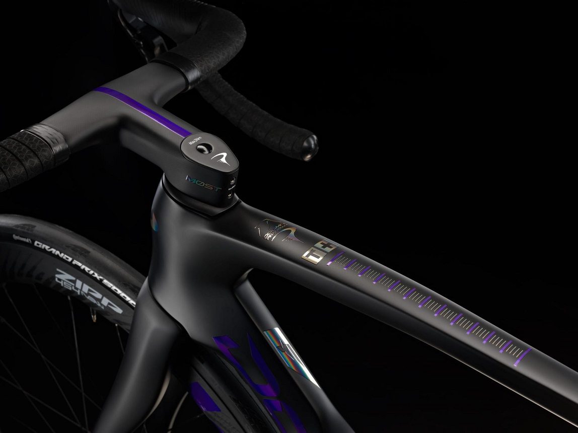 Mindössze 101 Tissot Dogma F készült, mindegyik exkluzív karbon-matt festéssel, hologram lila részletekkel és persze, tükörkróm feliratokkal díszítve az alsó csövön, az üléscsövön és a láncvillán. A vázzal kombinált Zipp WH454 NSW kerekeken is ugyanazok a Hologram Purple matricák láthatók, míg a felső csövet társmárkás logóval és hatásos grafikai elemekkel gazdagították, amelyek az idő múlását idézik.