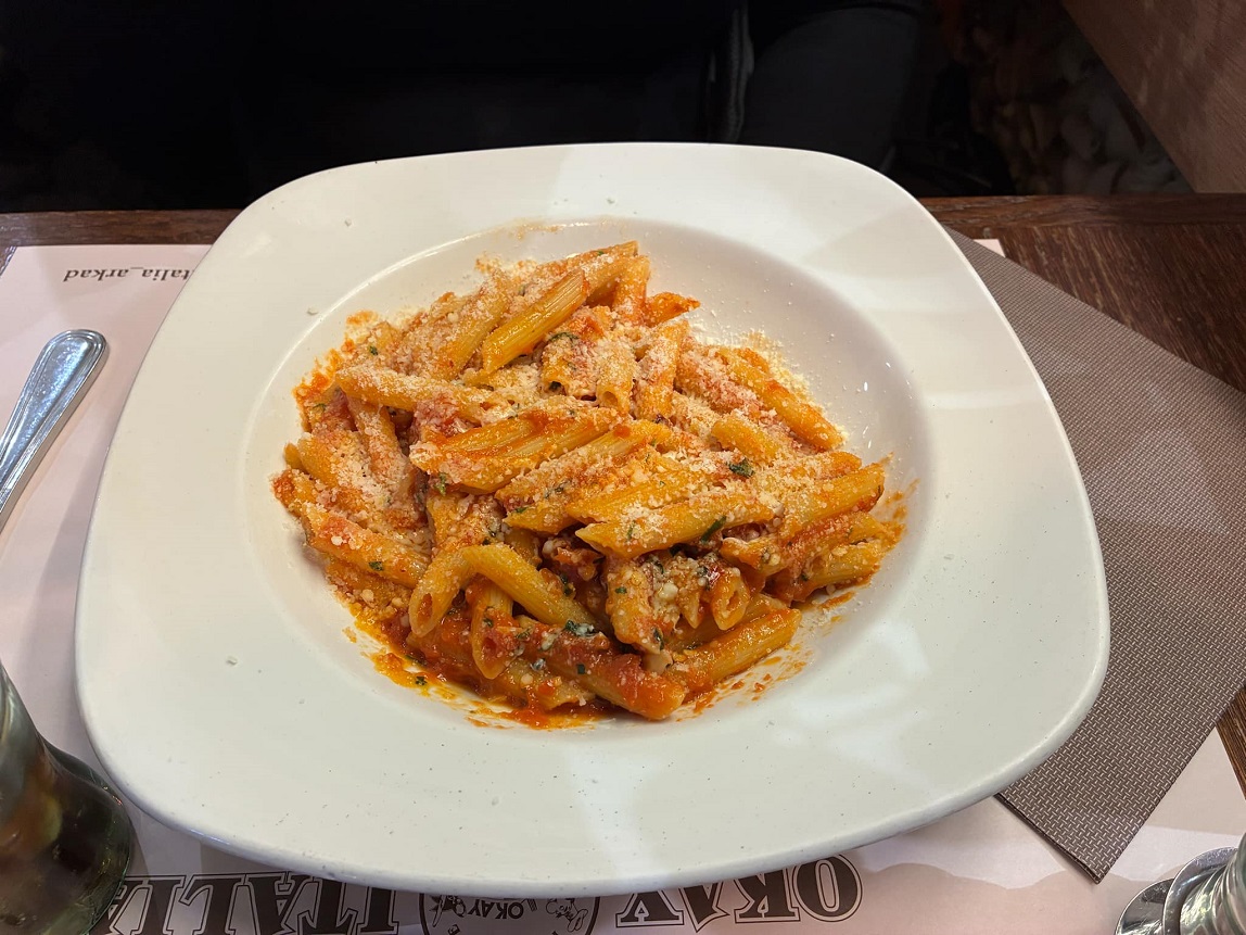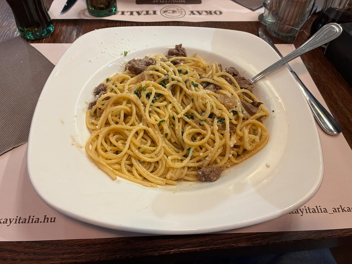 Amit itt külön tudok ajánlani - mert vannak ilyenek is - az a Pappone névre hallgató tésztájuk, ami tulajdonképpen egy hármas spaghetti, bélszínkockákkal, egy kis csilivel, és valami a húslevesre és a sültekre emlékeztető sugo-val. Elképesztően finom. Ugyanilyen favorit a sült tészták közül a Tagliatelle OK Italia, amely egy besütött tésztásétel, hússal töltött ravioli-val, bélszínkockákkal, paradicsommal, parmezánnal és egy kis csilivel. De kiváló az Arrabiata pennéjük is. A pizzájuk a nagyon jók közé tartozik a városban, és a húsételeik is előkelő helyet foglalnak el a ranglistánkon - a desszertjeikhez és a kávéjukhoz hasonlóképpen.