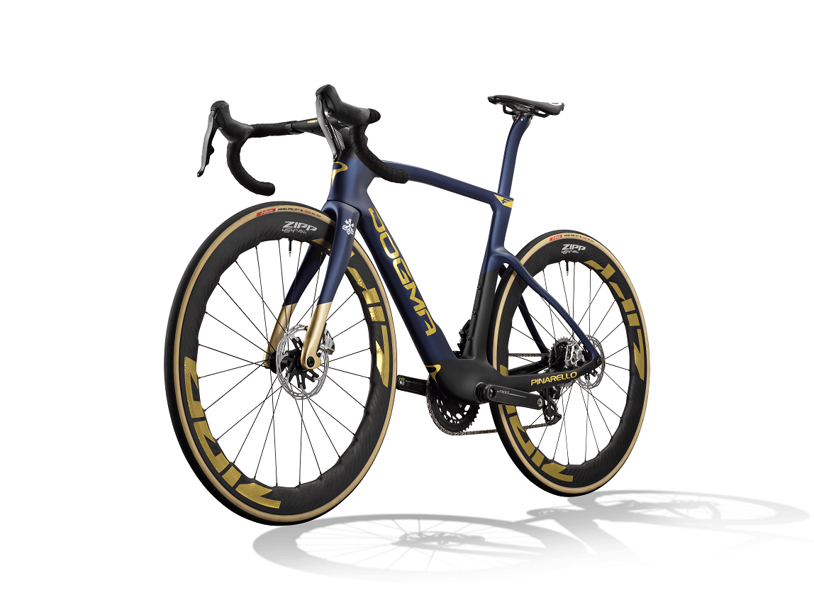 Pinarello Dogma F+ SRAM Red AXS 2x12 + Power meter + ZIPP WH454 NSW egyedi arany felirattal: “GOLD DECAL XDR”